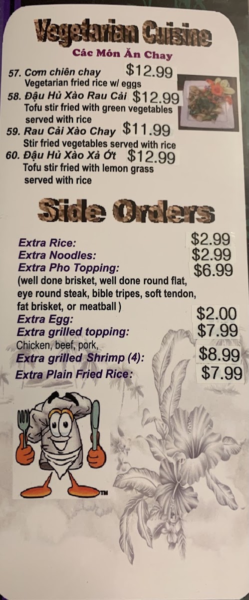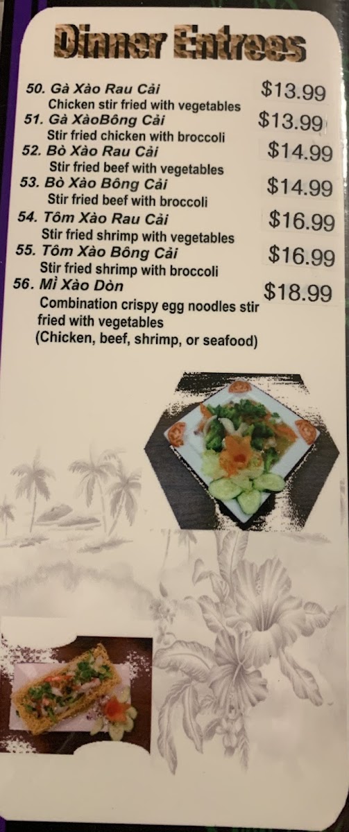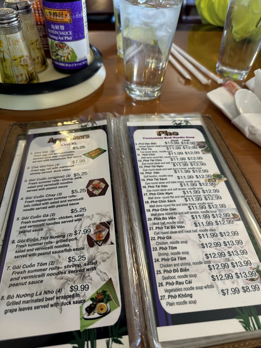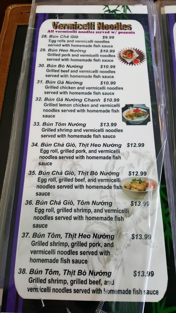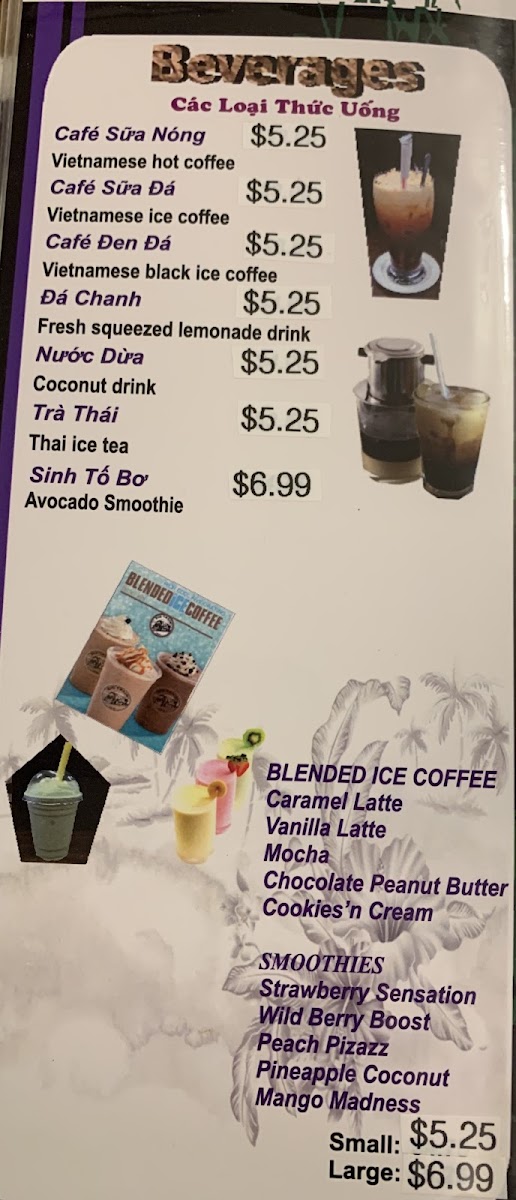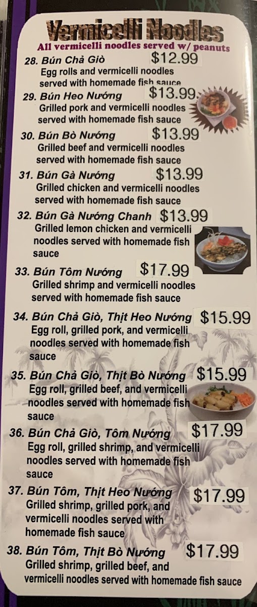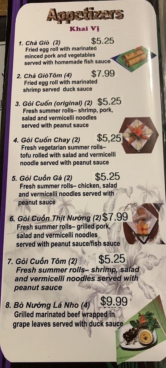 This menu suits a range of dining needs, from light bites and appetizers suitable for casual or quick orders to more substantial meals ideal for lunch or dinner. It provides a comprehensive selection of authentic Vietnamese dishes and beverages designed to appeal to a variety of tastes.