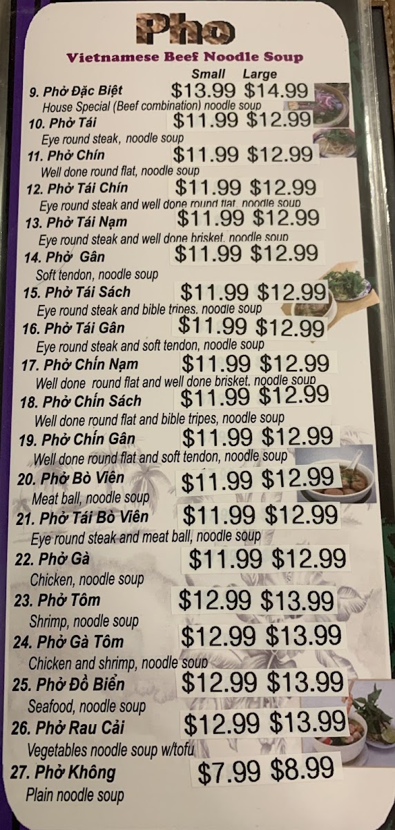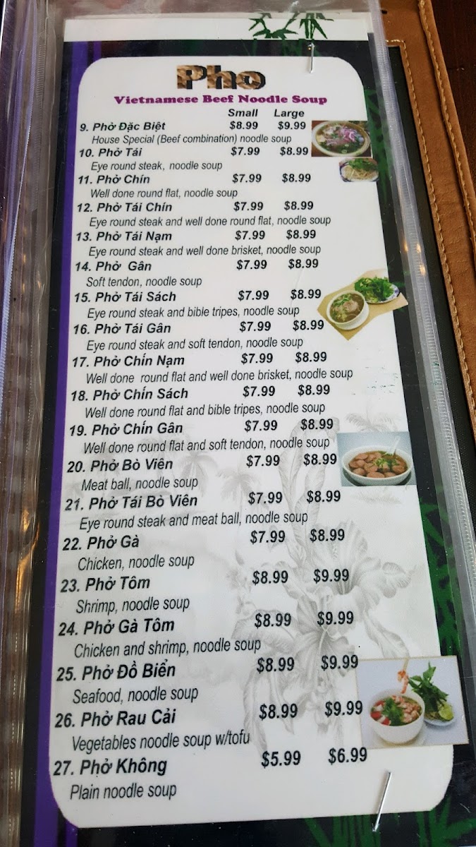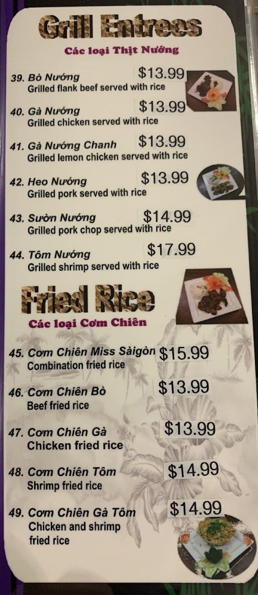 The menu at Pho Miss Saigon - PA 17033 offers a variety of Vietnamese and Southeast Asian dishes alongside a selection of beverages. It is organized into several categories that cater to different meal preferences and occasions, such as appetizers, main dishes, and drinks.